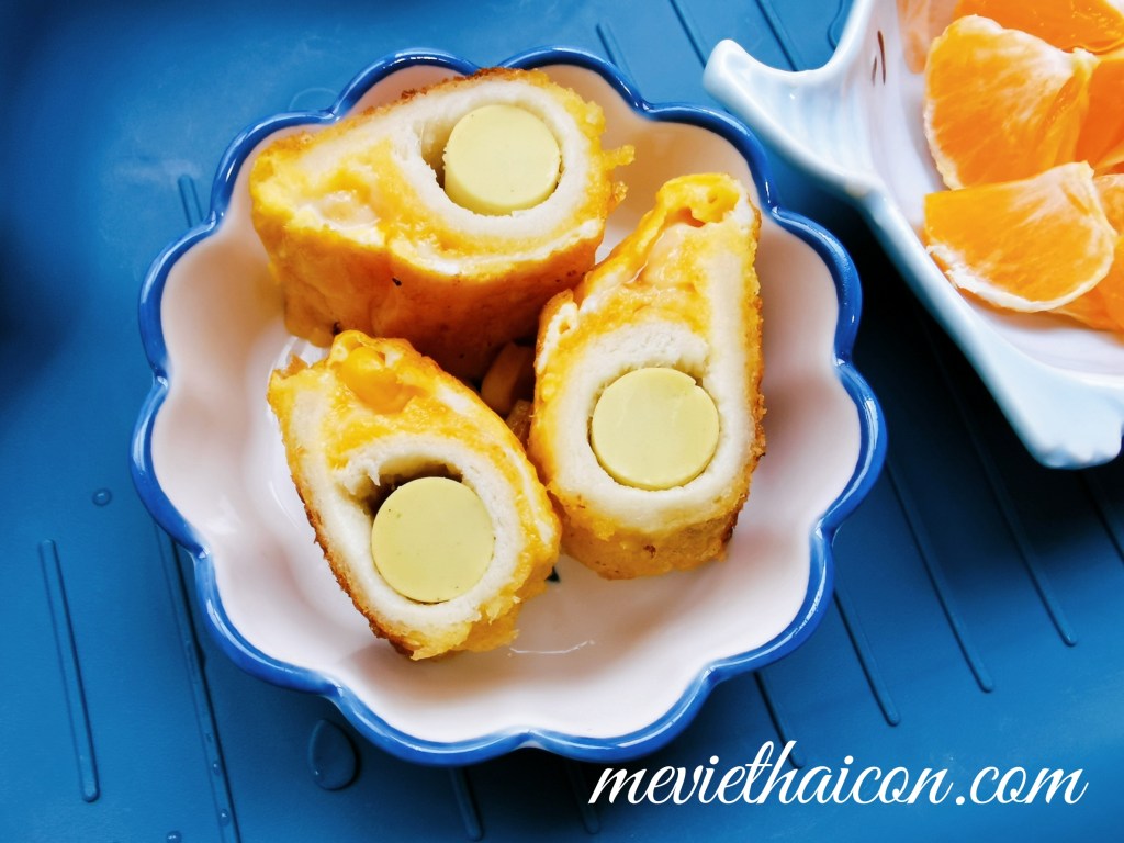 2- Bánh mì cuộn xúc xích lăn quay trứng đánh rồi tới vụn bánh mì, đem rán chín là hoàn thành.