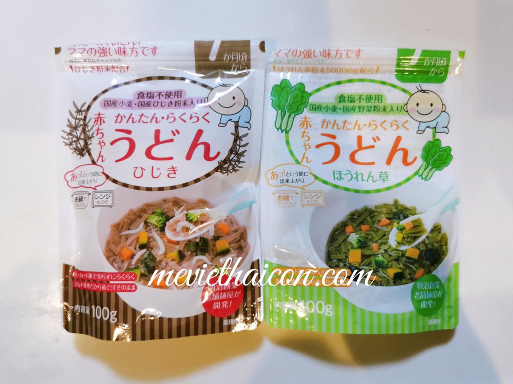 Đây là loại mì udon rong biển Hijiki và udon rau cải bó xôi mình mua cho Gaxi ở tiệm trẻ em Nishimatsuya. Hai loại này có thể dùng cho bé từ 7 tháng tuổi, họ cắt nhỏ sẵn rồi nên rất dễ nấu dễ cân đong nha.